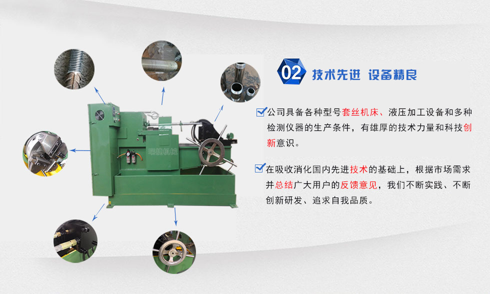 本套絲設(shè)備屬于無削加工設(shè)備,運用特殊的切削技術(shù),上絲輕盈快捷,提高生產(chǎn)效率,采用三點一線,同心度高,性能穩(wěn)定等優(yōu)點,本機(jī)每分鐘可切削3-5根工件,速度快,效率高,對于一些不定長度的鋼結(jié)構(gòu)公司,橋梁工程,電力設(shè)施等大企業(yè)的批量生產(chǎn)之需要。